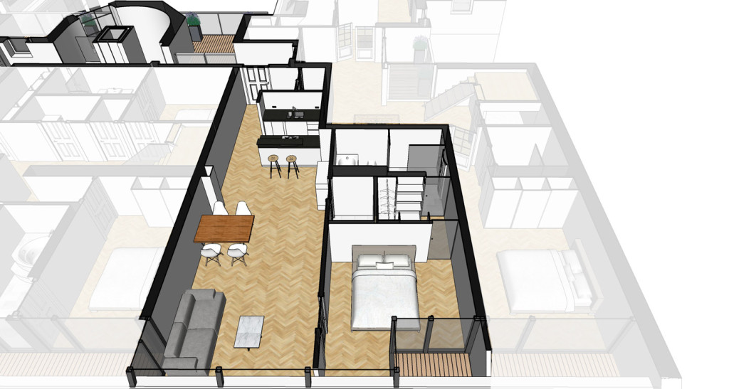 Living room 33m2 with kitchen integrated. Sleeping room next 12m2, cloak- and bath room ensuite. Mini-terrace 1,4m2 in front of the sleeping room.
